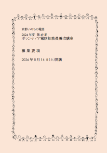 第49期電話相談員養成講座の受講生募集を開始します。 2026年5月開講予定です。あなたも私たちと一緒に活動しませんか? 電話相談員募集のための動画をアップしました。 日本いのちの電話連盟作成の動画を掲載しました。相談員養成講座のお申し込みを考えている皆様、どうぞこちらの動画も参考にしてください(約2分) ニュースレターを掲載 ニュースレター125号(2025.11.21発行)を掲載しました。» 詳しくはこちらから 電話相談員養成講座説明会のおしらせ 2025年3月21日(土) 第49期電話相談員養成講座の説明会を開催します。募集要項の説明や、相談員がどんな活動をしているかなど、お話しします。どうぞお気軽にご参加ください。事前のお申し込みが必要です。» 詳しくはこちら 初心者向け傾聴講座のおしらせ 京都いのちの電話提供「初心者向け傾聴講座」を開催します。事前のお申し込みが必要です。» 詳しくはこちら 相談員の声(1) 京都いのちの電話で活動中の「相談員の声」を集めました。(pdfファイル)» 詳しくはこちら 相談員の声(2) 京都いのちの電話で活動中の「相談員の声」を集めました。(pdfファイル)»詳しくはこちら チャリティーコンサートのおしらせ(終了しました。ご協力ありがとうございました。) 2025年12月14日(日) 京都いのちの電話主催 チャリティーコンサートを開催します。恒例のミニバザーも行います!» 詳しくはこちら 2024年度のご報告 2024年度の事業報告を掲載しました。» 詳しくはこちらから 資金ボランティアのお願い 資金ボランティアのページを更新しました。あなたも京都いのちの電話を支えるおひとりになっていただけませんか。» 詳しくはこちらから 公開講演会のお知らせ(終了しました) 2025年10月13日(月・祝) 島田妙子氏をお招きし、「いのちと向き合うために~私たちにできること~」と題し公開講演会を行ないます。事前のお申し込みが必要です。皆様のご参加をお待ちしております。» 詳しくはこちら ニュースレターを掲載 ニュースレター124号(2025.3.10発行)を掲載しました。» 詳しくはこちらから ニュースレターを掲載 ニュースレター123号(2024.11発行)を掲載しました。» 詳しくはこちらから ニュースレターを掲載 ニュースレター122号(2024.3発行)を掲載しました。» 詳しくはこちらから ニュースレターを掲載 ニュースレター121号(2023.11発行)を掲載しました。相談員のメッセージも掲載!» 詳しくはこちらから